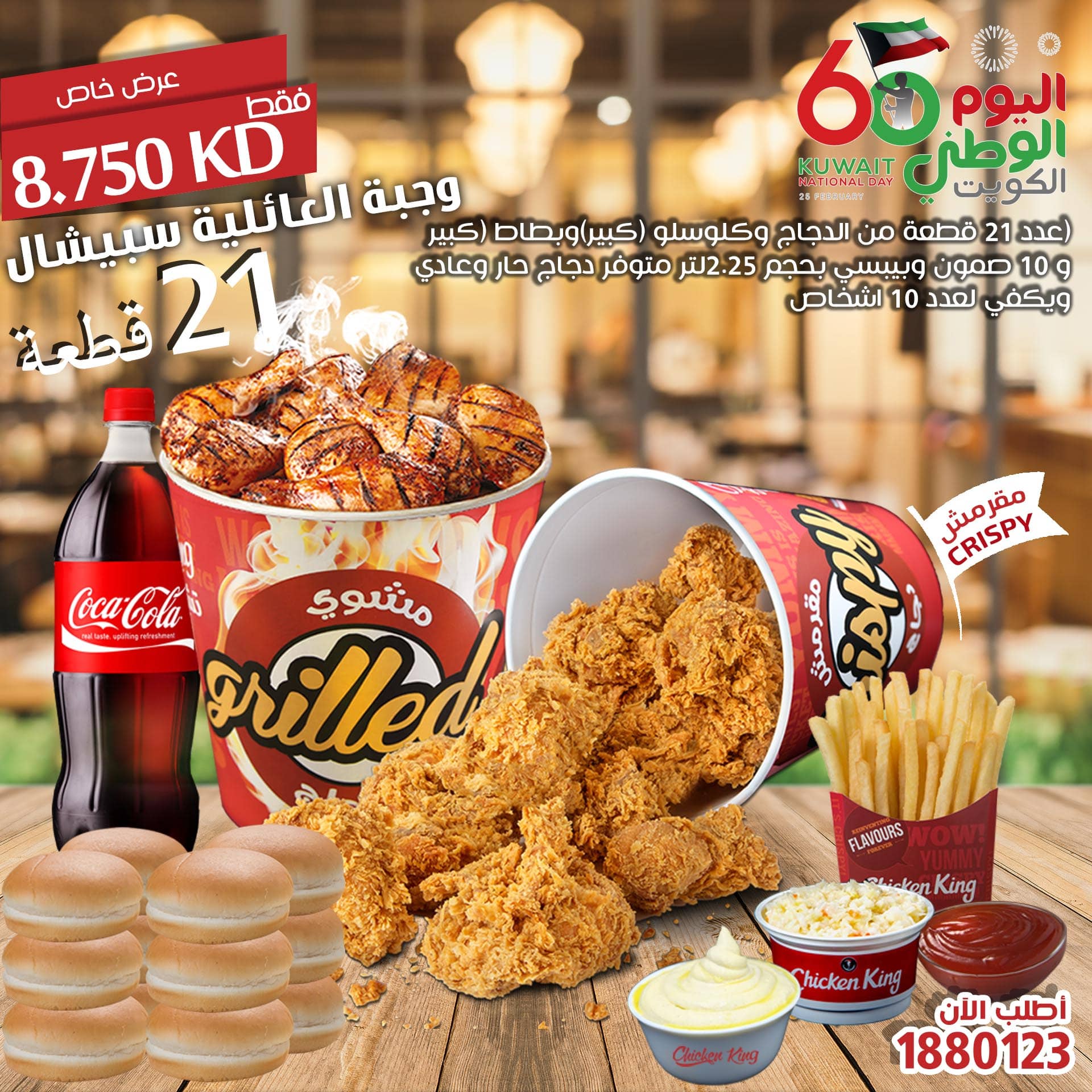 21قطعة من الدجاج وكلوسلو (كبير)وبطاط (كبير) و 10 صمون وبيبسي بحجم 2.25لتر متوفر دجاج حار وعادي ويكفي لعدد 10 اشخاص